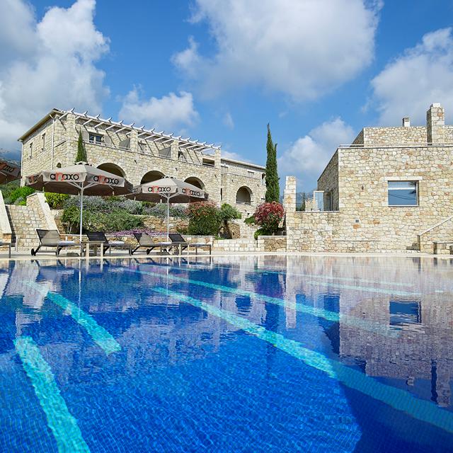 “Goddelijk!” Eigenaar George komt aanlopen met een drankje en lacht om mijn antwoord op zijn vraag hoe ik het vind in zijn Anaxo Resort. Hij glimlacht. “Ik had niet anders verwacht!” zegt hij en zet het ijskoude glas neer dat hij in de poolbar voor me haalde. Ik lig op een bedje aan het zwembad onder de parasol in de schaduw. De zon staat hoog aan de strakblauwe lucht, in de verte prijkt de zee, achter me ligt het bergachtige land. Anaxo Resort ligt vredig onderaan de heuvels. Recent bouwde George hier twee prachtige authentieke gebouwen van natuurlijke materialen, met dikke muren en in de stijl van zijn zo geliefde Griekenland. Treed je binnen in zijn paleis, dan herken je nog diezelfde Griekse elementen, maar daar siert het moderne van nu: een strakke, luxe en stijlvolle inrichting in natuurlijke kleuren.